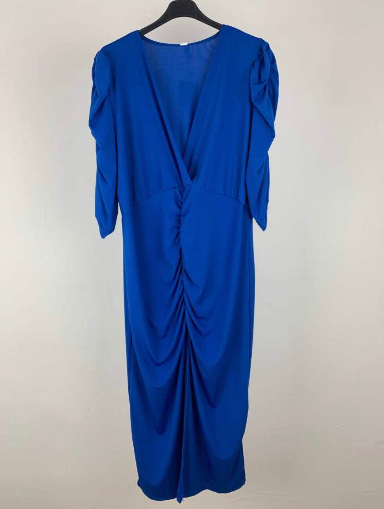 Vestido midi con manga francesa fruncida, el frontal fruncido y abertura delantera dando el toque sexy.