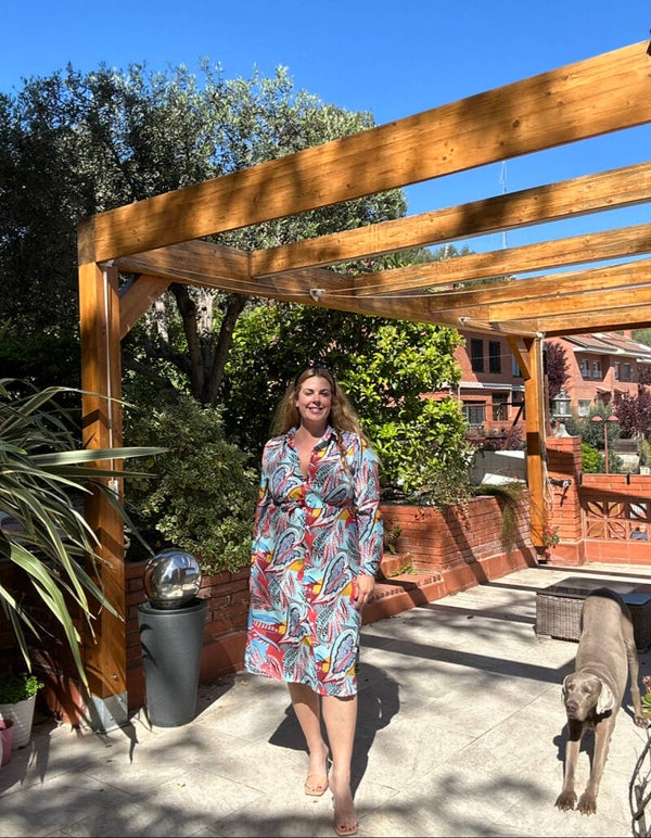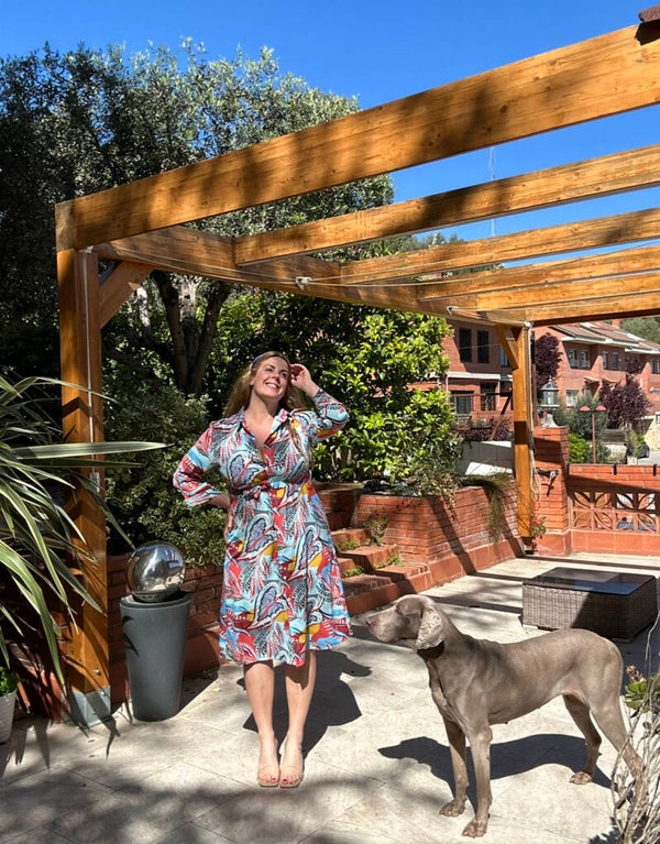 Lleva un cinto de la misma tela del vestido que lo puedes poner o sacar.