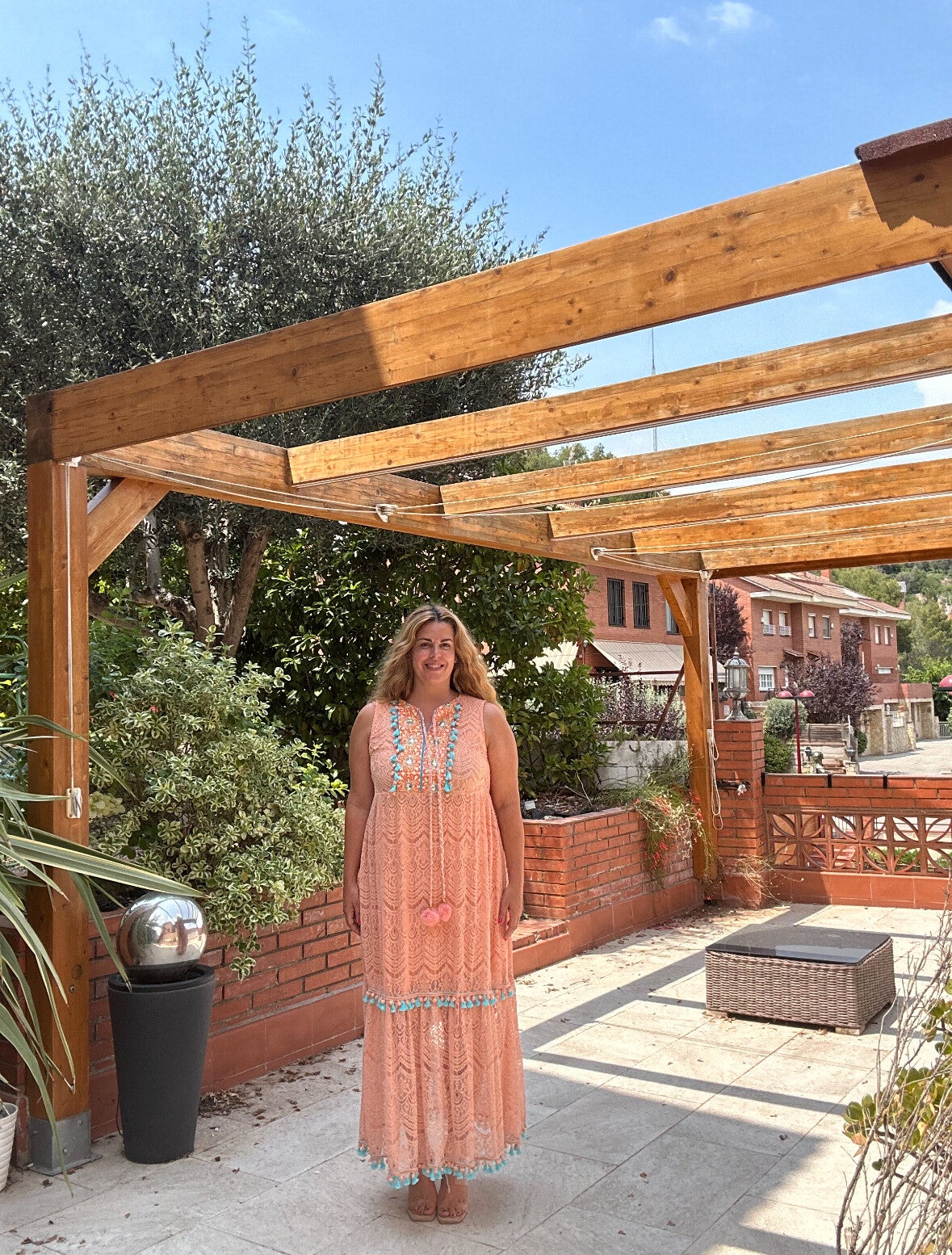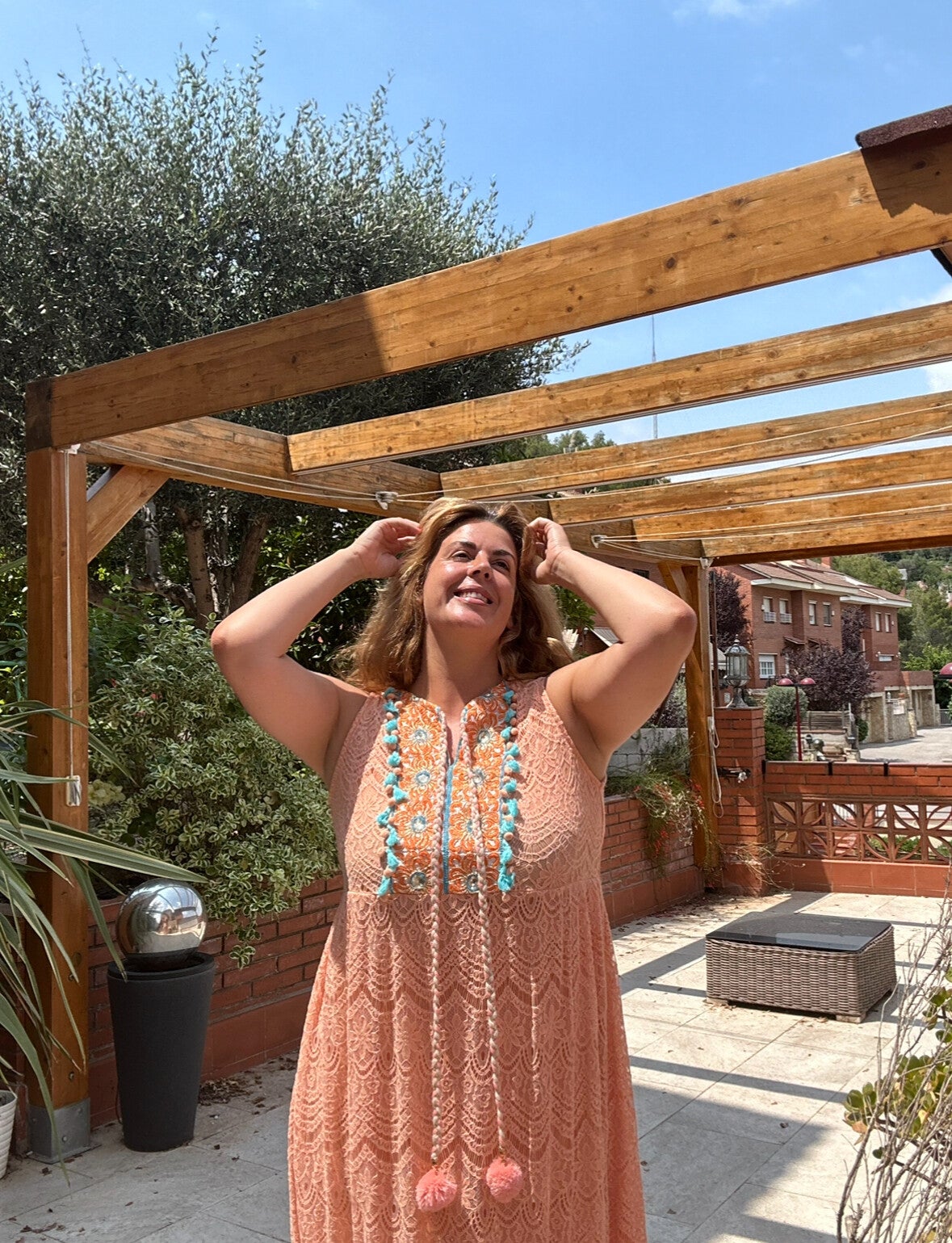Precioso vestido con dos pompones en sus tiras y forro interior.