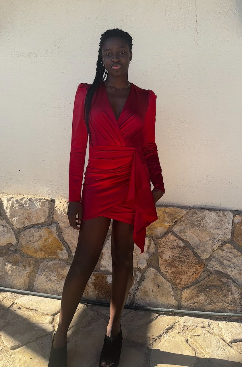 Vestido corto con volante lateral y escote en pico.