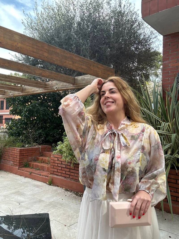 Preciosa blusa floreada con lazada.
