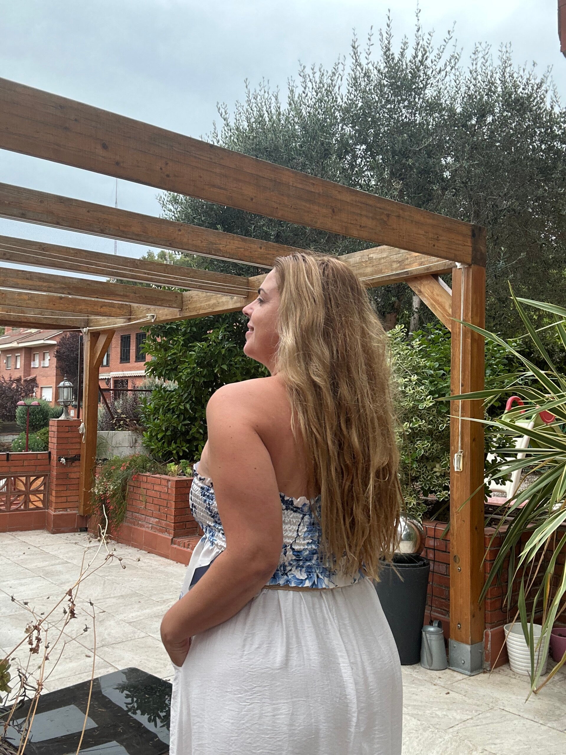 Precioso top palabra de honor acabado en pico y por detrás tiene nido de abeja para ajustarse bien a casa cuerpo.