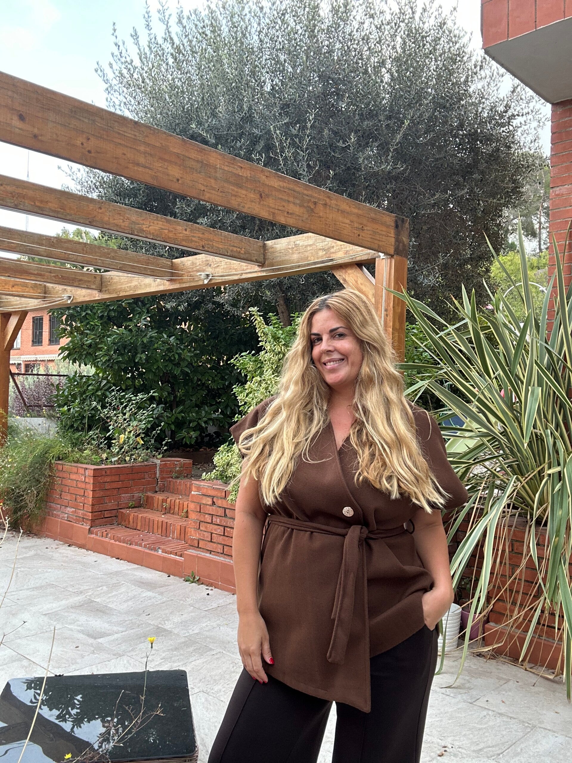 Precioso chaleco con un botón interno, otro externo y cinto.