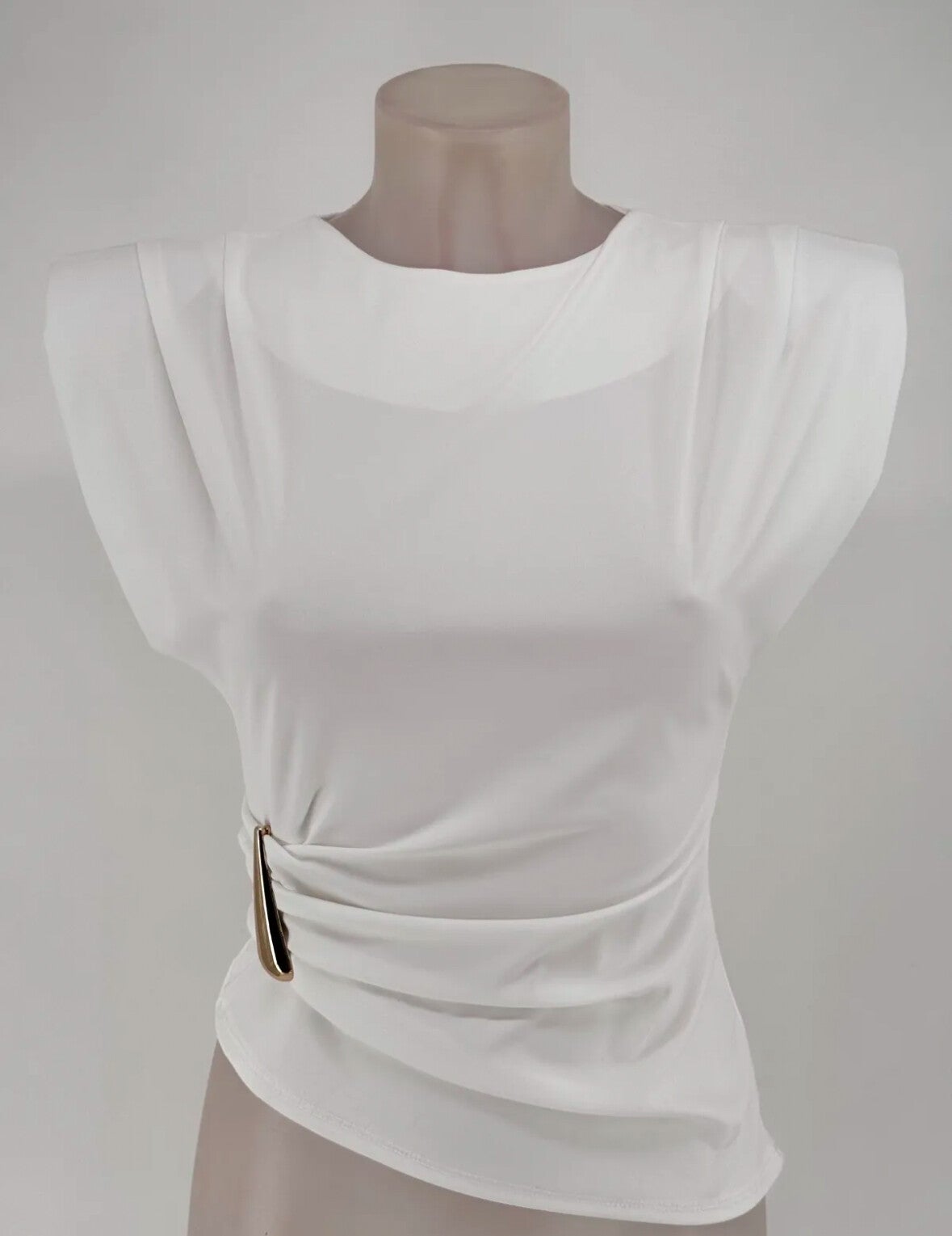 Blusa asimétrica con hombreras y aplique dorado en un lateral en forma de gota alargada.
