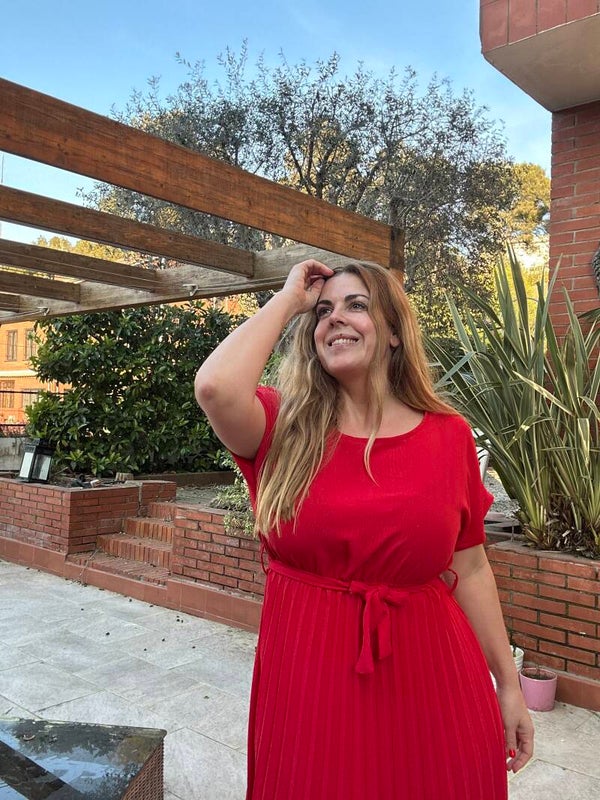 Precioso vestido con la parte de arriba lisa, mangas, goma en la cintura, cinto y parte de abajo tablas.